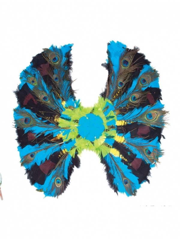 Paire d’ailes en plumes de paon pour femme avec Ă©lastique de maintien.