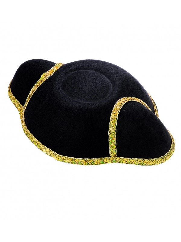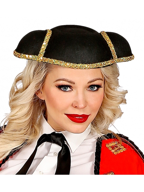 Ce chapeau noir de Toréador est joliment conçu Il est en feutre et décoré de galon doré.