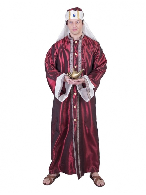 Déguisement Prince Arabe bordeaux pour homme avec coiffe ornée de perle et voile blanc.