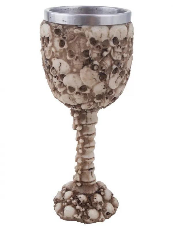 L’intĂ©rieur du gobelet est en inox, garantissant une utilisation sĂ»re et facile, tandis que l’extĂ©rieur est entièrement recouvert de crânes humains en plâtre pour une touche macabre.