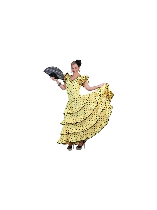 Découvrez notre magnifique robe de flamenco femme jaune à pois noirs pour des soirées pleines de grùce et de passion !