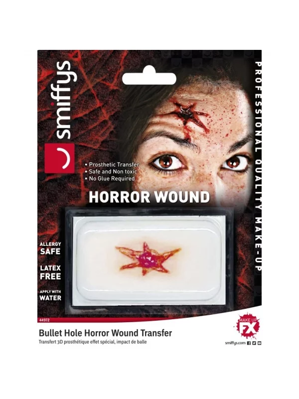 Cette blessure par balle est d’un réalisme surprenant. Si vous voulez donner une peur bleue à vos amis, c’est le produit idéal.