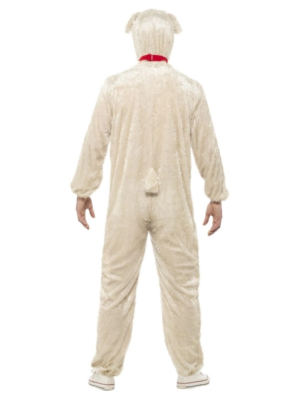 Disponible uniquement en taille M, cette tenue est marron. Le produit est livrĂ© avec une combinaison marron (fermeture sur le devant, texture velours et collier rouge) et une cagoule marron (forme de tĂȘte d’agneau).