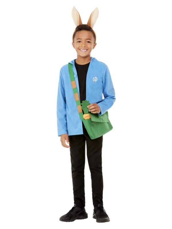 Le déguisement comprend une veste bleue, un serre-tête avec des oreilles de lapin, un sac et une carotte. Le tout est conçu dans des matériaux de qualité pour assurer confort et durabilité.