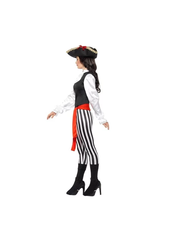 Ce costume vous permettra de vous transformer en une pirate de haut rang et intrépide grâce à sa chemise satinée, son pantalon moulant à rayures, son tour de cou gothique, sa ceinture et ses couvre-bottes. Vous pourrez laisser libre cours à votre imagination et incarner la flibustière des mers que vous désirez être, prête à lancer de nouvelles légendes. Il vous suffit d’ajouter un chapeau tricorne et un sabre pour partir à l’abordage avec courage.