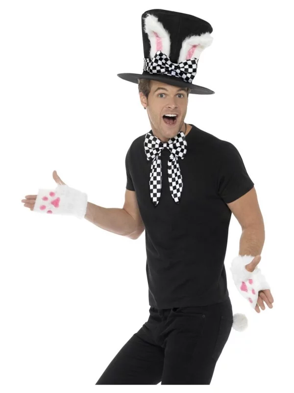 Portez ce kit de Chapelier Fou avec de longues oreilles et un large ruban en damier noir et blanc, un noeud-papillon, des gants et une queue. Il s’adaptera Ă la perfection avec le personnage que vous souhaitez incarner.