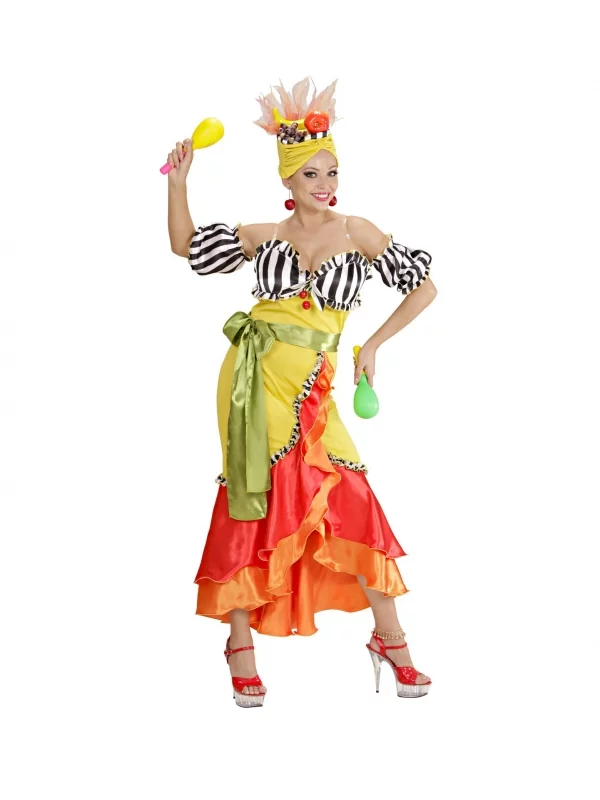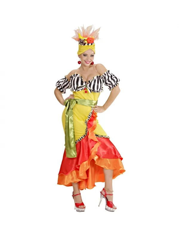 Ajoutez Ă cela la coiffe fruitĂ©e qui accompagne la panoplie, et vous avez tout un personnage habillĂ© Ă la gloire des fĂȘtes dans votre miroir. Il ne vous reste plus quâĂ vous maquiller et Ă mettre les bijoux carnavalesques adaptĂ©s.