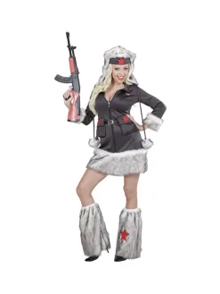 Cette panoplie de militaire sexy est composée d’une robe grise agrémentée de touffes de fourrure à la manche et en bordure de la jupe.