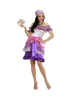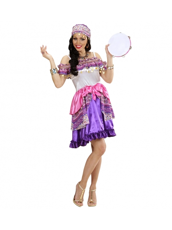 Ce déguisement de gitane pour femme est idéal pour ceux qui cherchent un costume à la fois séduisant et coloré. Avec des couleurs vives telles que le violet et le rose, des motifs à fleurs, du blanc et des pièces de monnaies dorées placées sur la robe, il ne fait aucun doute que vous serez la plus belle lors de votre soirée costumée.