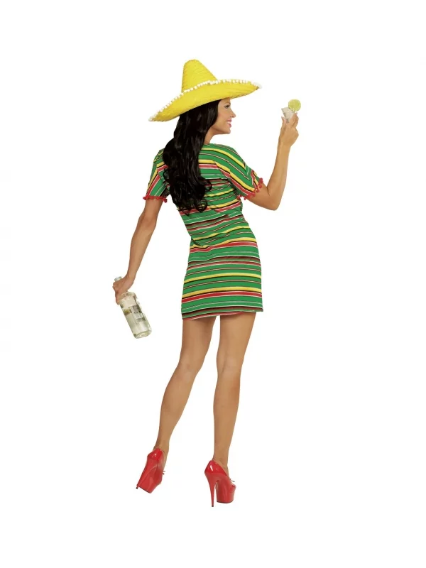 Il s’agit d’une robe courte décolletée et à manches courtes, dans une apparence rayée au style aztèque. C’est un excellent départ pour mettre au point un déguisement Mexicaine sexy et d’avant-garde !