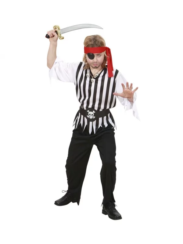 La panoplie comprend une casaque rayée à longues manches, un pantalon, ainsi qu’une ceinture décorée d’une tête de mort. Pour ajouter une touche d’authenticité, votre petit pirate pourra également porter un bandeau rouge.
