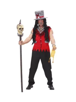 Le déguisement se compose d’une veste rouge sans manches avec un bas en dents de scie, ce qui ajoute un côté sauvage à l’ensemble. La veste est près du corps et se ferme à l’avant à l’aide de boutons. Les bandes noires et blanches présentes au niveau du col et des poches rappellent les peaux de bêtes portées par les véritables prêtres vaudous. Le pantalon noir, ample à souhait, complète le déguisement et assure votre confort.