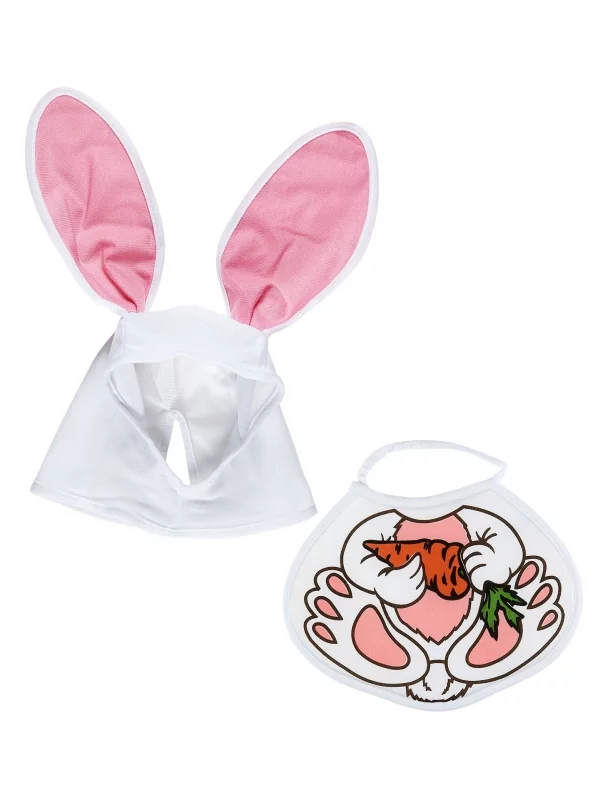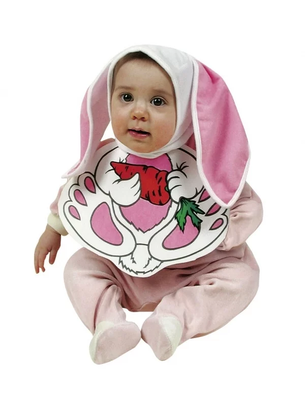 Voilà une idée sympa de cadeau pour bébé ou de déguisement simple à enfiler. Aux couleurs du lapin , ce kit est blanc et rose, comprend un bavoir et un bonnet.