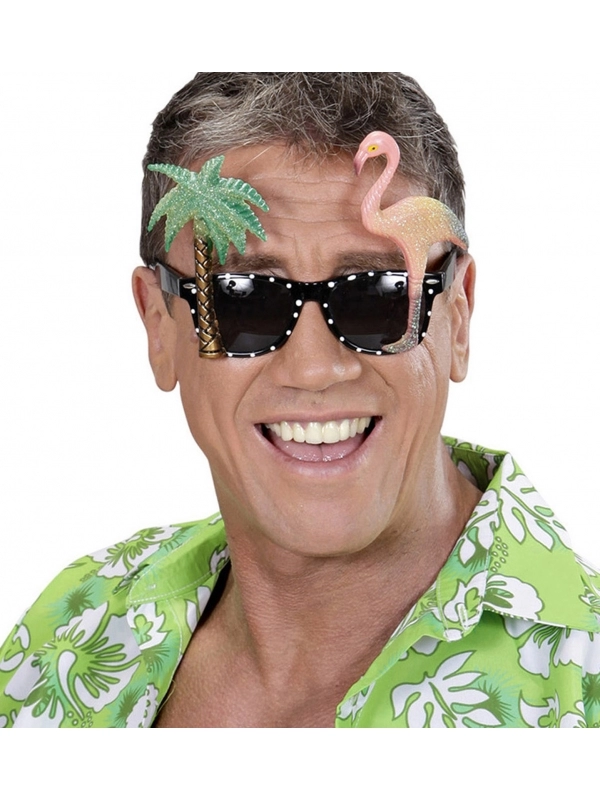 Lunettes fantaisies tropicales avec flamand rose et palmier pour vos soirĂ©es d’Ă©tĂ©, soirĂ©e hawaĂŻenne ou enterrement de vie de cĂ©libat.