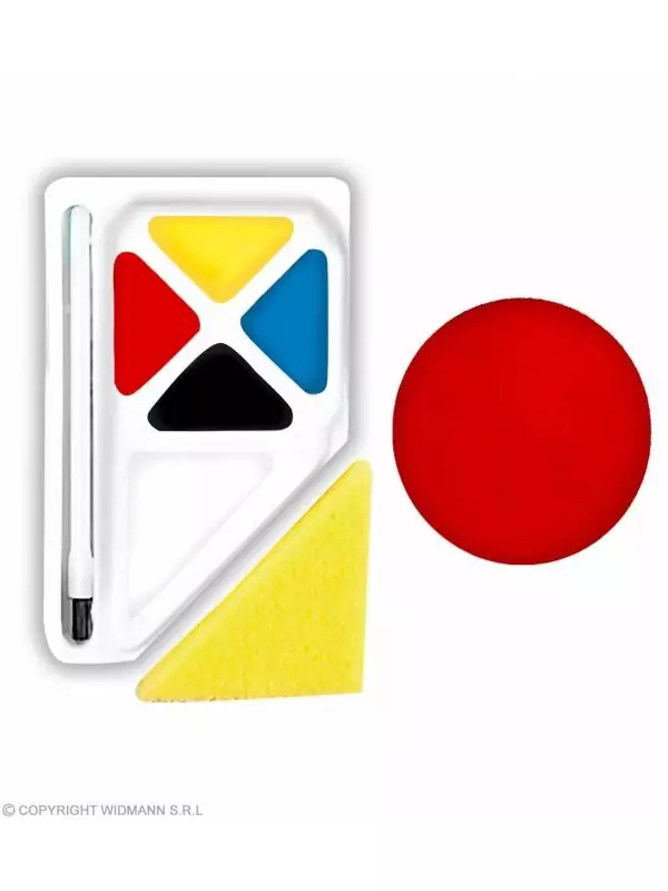 Voici une palette de maquillage qui comprend l’essentiel en terme de couleurs et en prime un nez rouge en Ă©ponge.