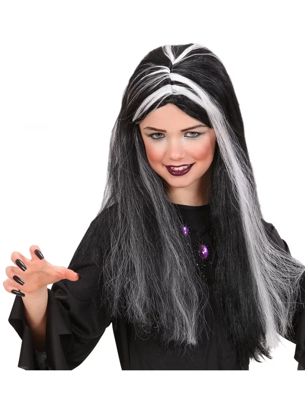 Perruque de sorcière enfant noire avec mèches blanches